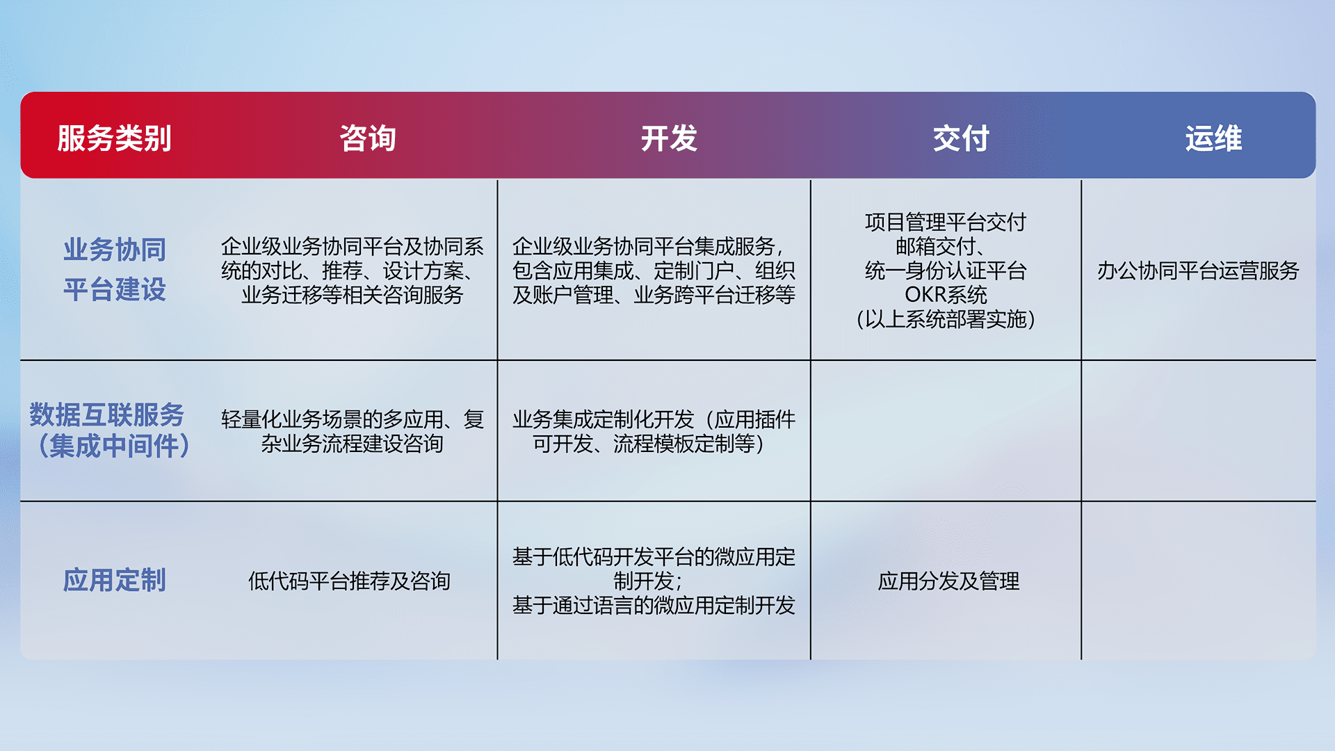 针对钉钉、、企微、、、、IDaas等平台级产品提供产品的规划、、、、方案、、、、交付、、、、定制化开发等服务,,实现如统一协同办公、、、、智能客户服务、、混合会议管理、、智能数据查询、、、、等业务场景,,实现数字化转型。。。